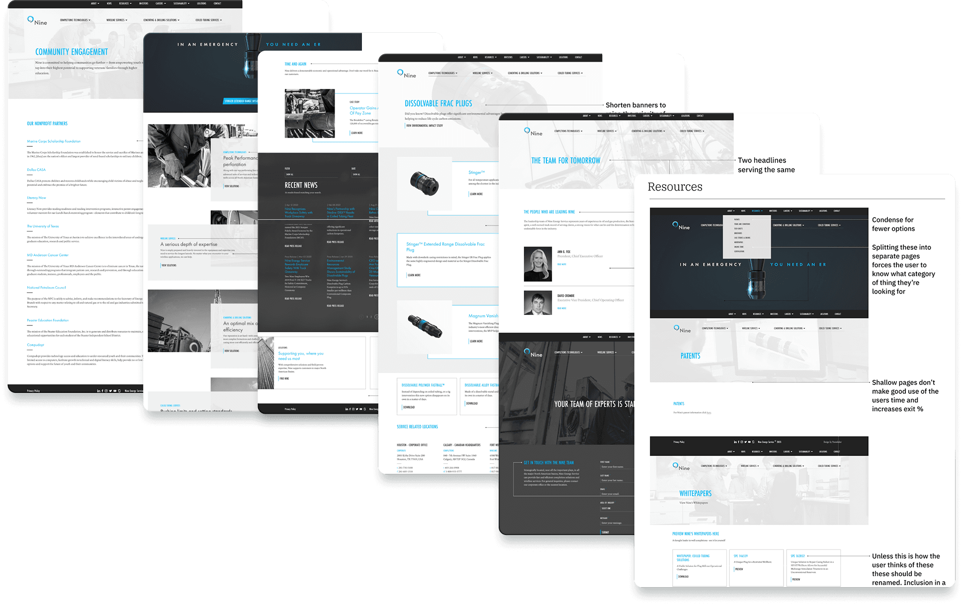 Incremental additions over time had made the sites navigation a bit of a mess. Dead end pages, siloed resources, and very little help understanding the sites hierarchy. However, we did still like how Nine’s four main service lines were given their own space separate from all the other items in the utility nav.